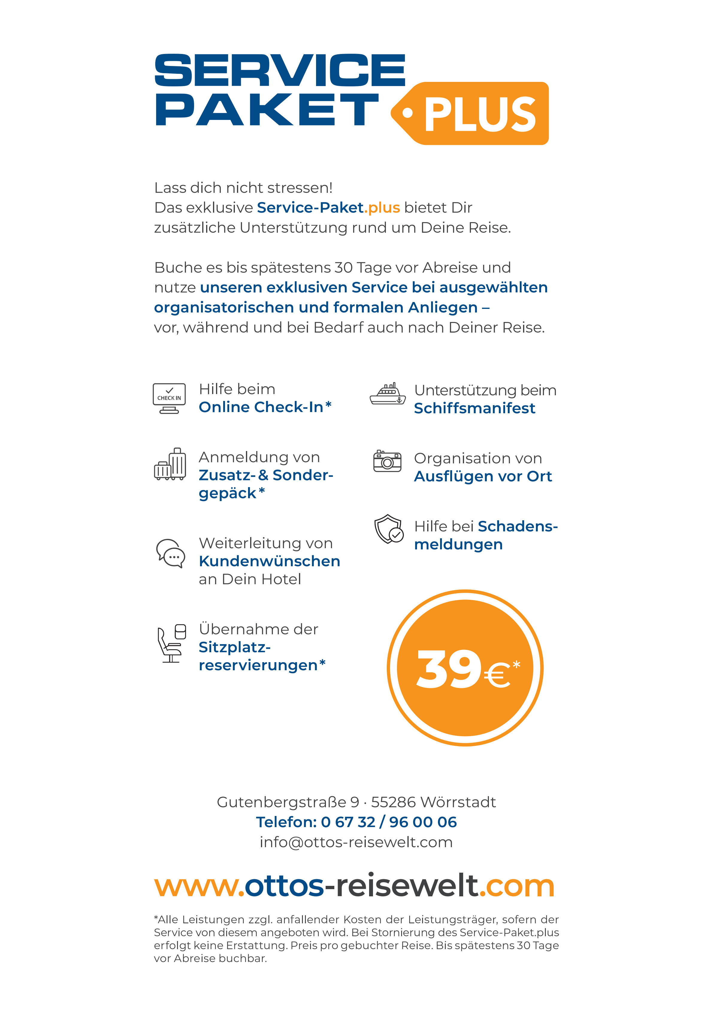 Buche dieses exklusive Paket bis zu 30 Tage vor deiner Abreise und profitiere von zusätzlichen Vorteilen, die deine Reise noch angenehmer gestalten. Neben unserem gewohnten Service erwarten besondere Angebote, die dir helfen, deine Reise optimal zu planen und zu genießen.